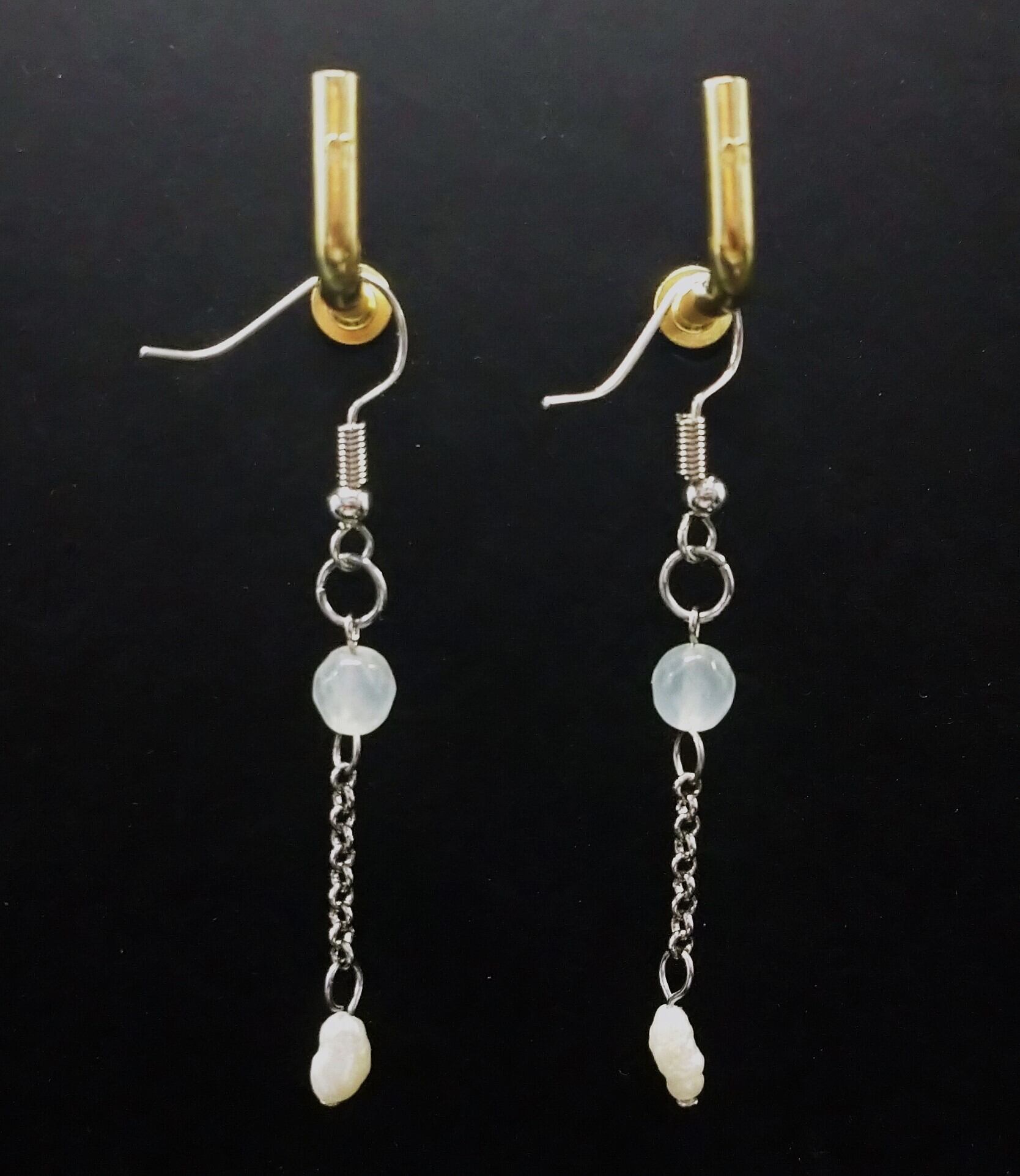 ニュージェイドと淡水パールを使ったピアスです。 金属の素材はアレルギー対応のものではりません。ご注意下さい。 管理番号115